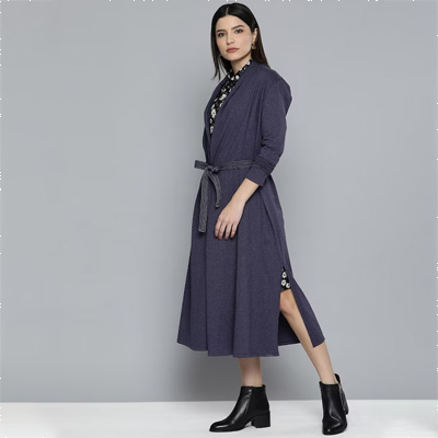 Navy blue solid tie-up longline full length cover up shrug ,has three-quarter sleeves, flared hem
