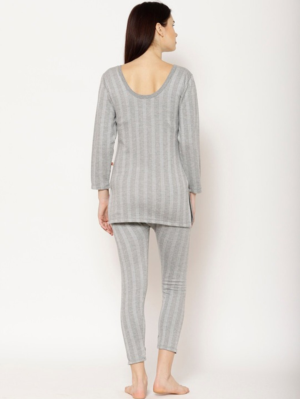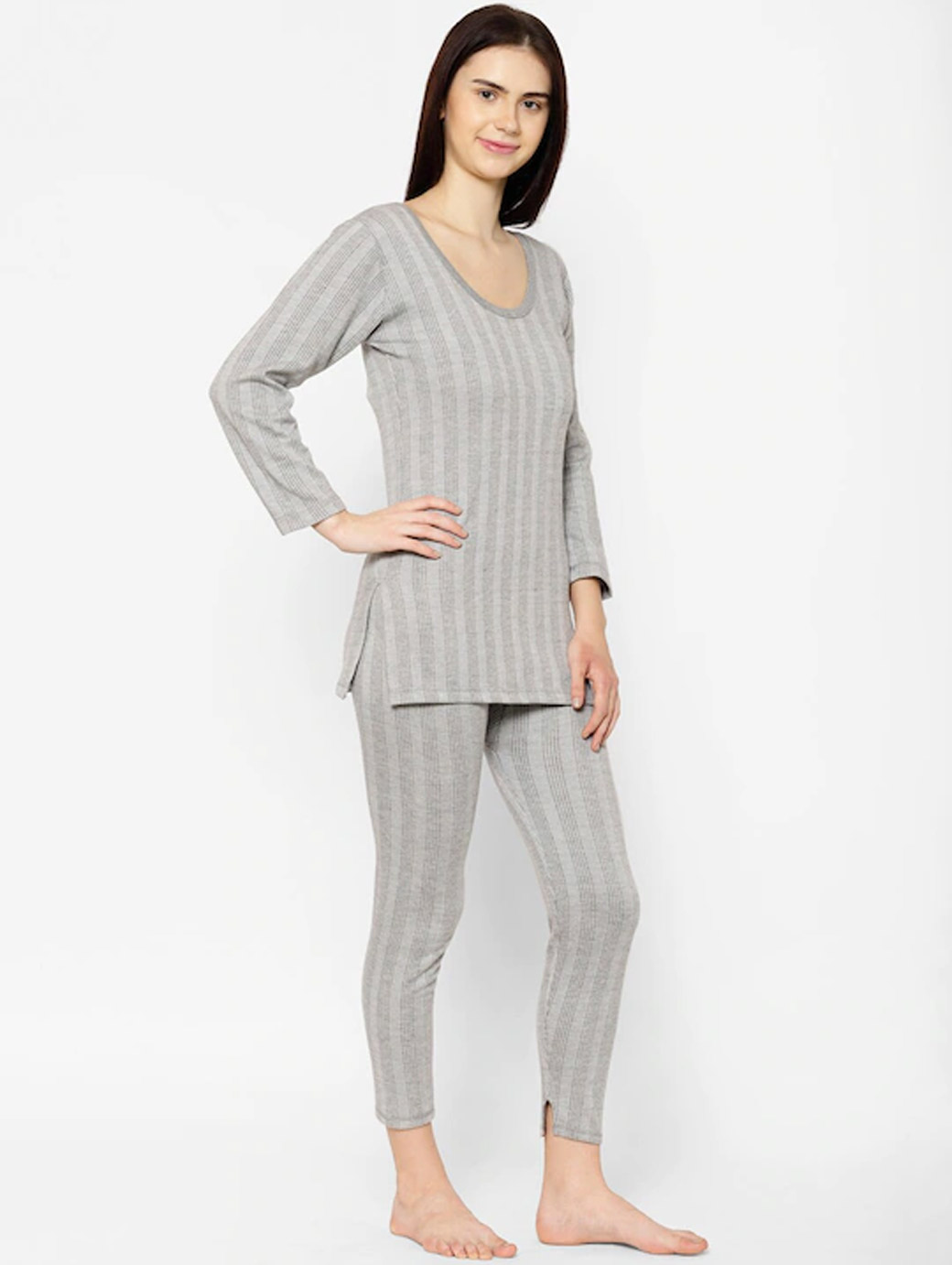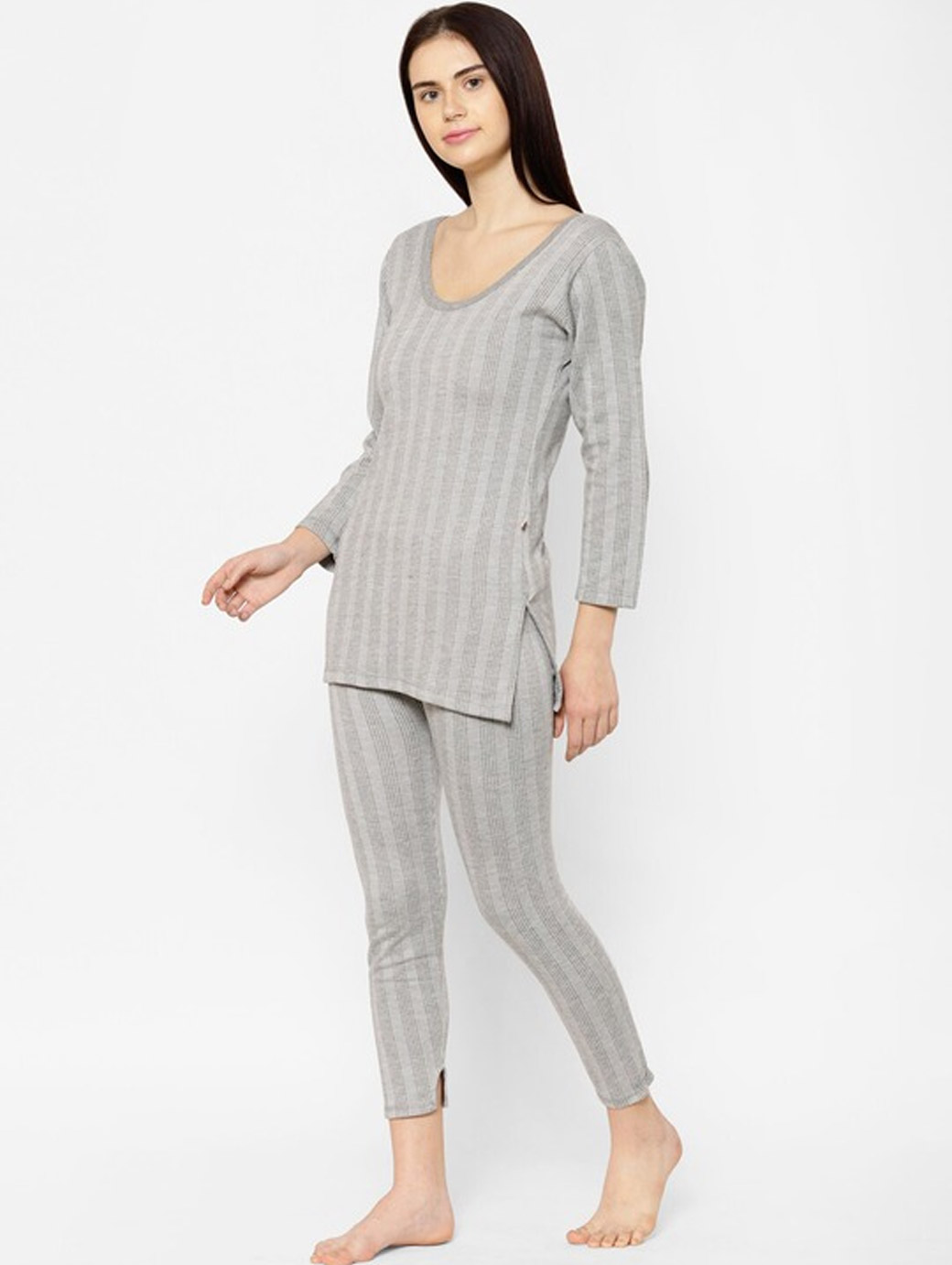Grey striped thermal top, each has round neck, long sleeves, side slits