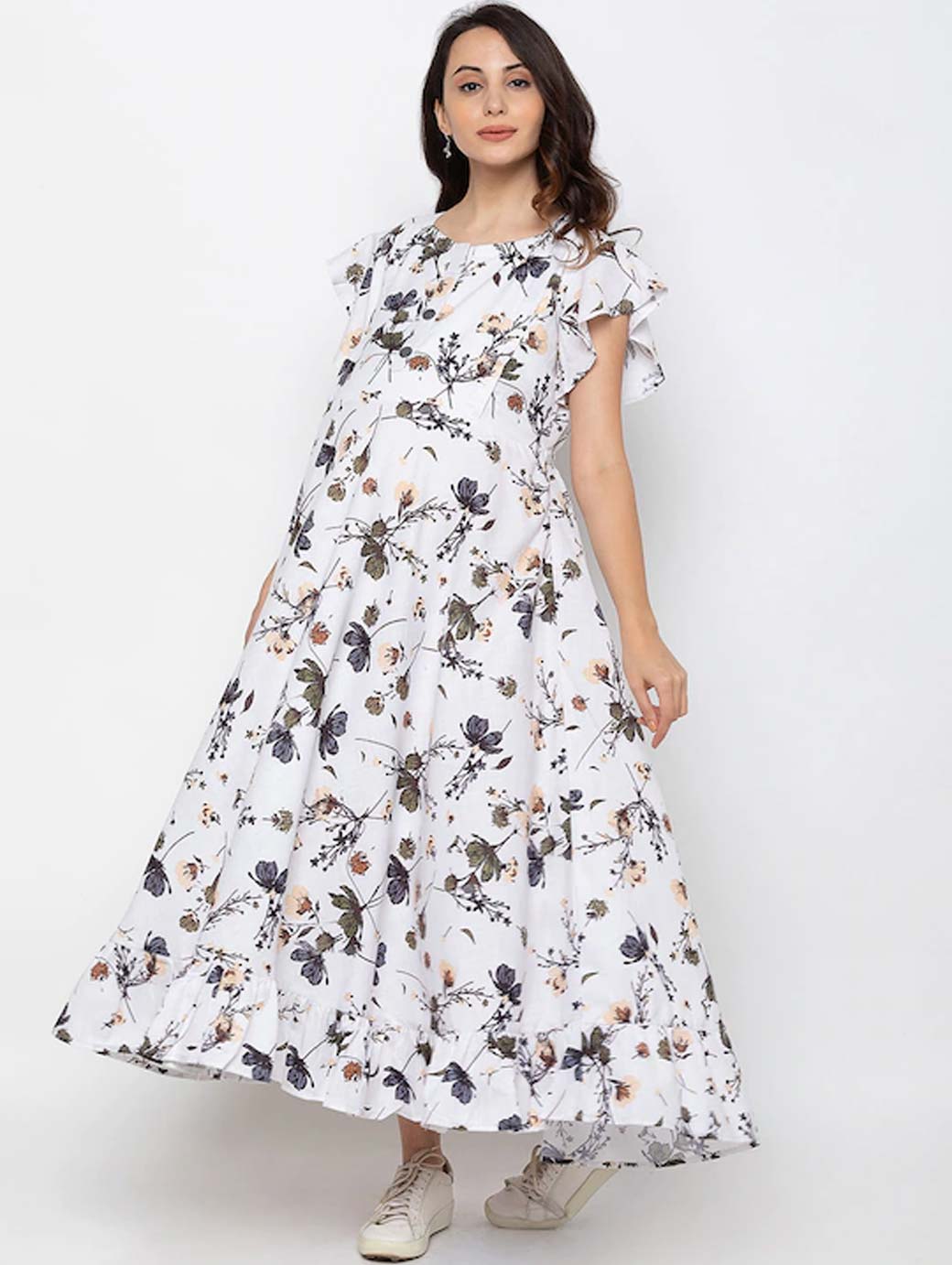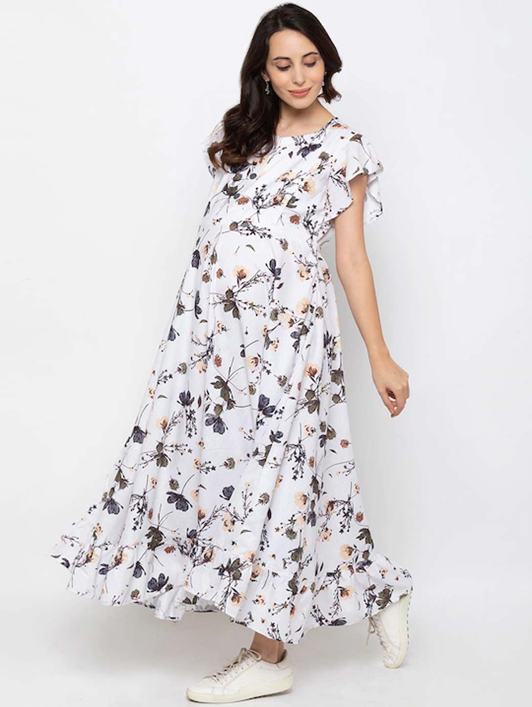 Women White & Green Floral Printed Maternity Nursing Maxi Dress